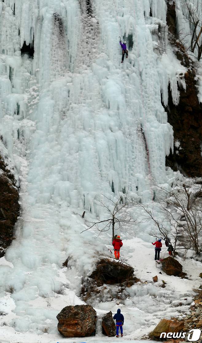 (인제=뉴스1) 정진욱 기자 = 북극발 한파가 강해져 추운 날씨가 이어진 11일 강원도 인제군 북면 용대리 매바위 인공폭포가 꽁꽁 얼어 빙벽을 이루고 있다. 2021.1.11/뉴스1