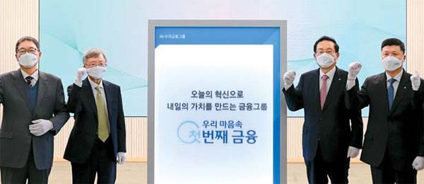 우리금융이 11일 우리금융그룹 본사에서 지주 창립기념식과 함께 비전선포식을 개최했다. 손태승 우리금융 회장(왼쪽 셋째)이 권광석 우리은행장(왼쪽 넷째), 박상용 사외이사(왼쪽 첫째), 노성태 사외이사(왼쪽 둘째)와 2021년 우리금융그룹 비전선포식에서 기념촬영을 하고 있다.
