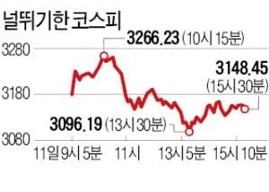 장 초반 개인의 매수세에 3266.23으로 사상 최고치를 찍더니 기관 외국인 동반 순매도에 오후 1시30분께 3096.19까지 떨어졌다.