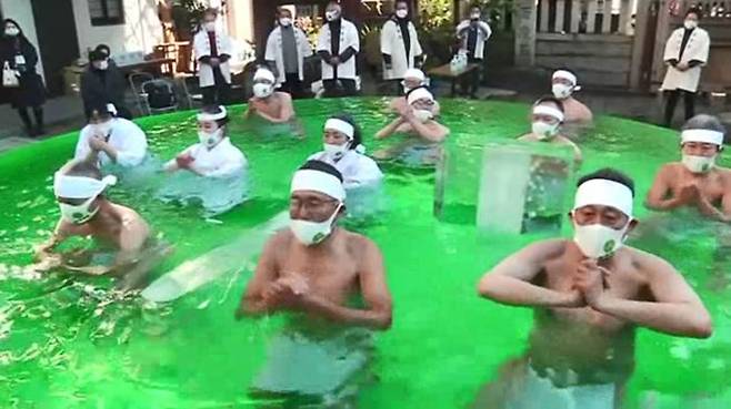 도쿄의 한 신사에서는 코로나19가 종식되길 소망하는 '얼음물 기도' 의식이 열렸습니다.
