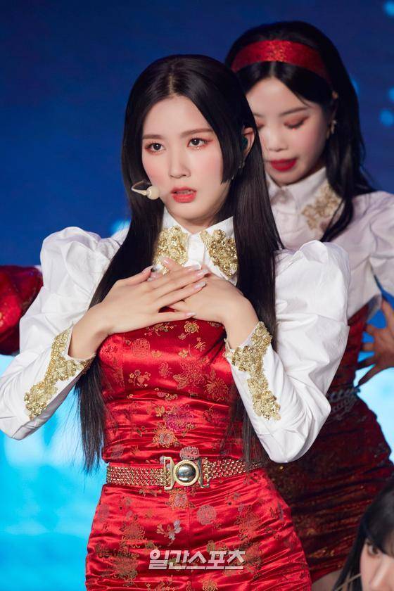 (여자)아이들(수진, 미연, 소연, 우기, 슈화, 민니) 멤버들이 타이틀곡 ‘화(火花)’를 선보이고 있다. <사진=큐브엔터테인먼트 제공>