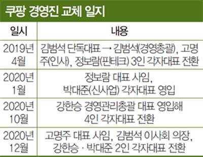 실제 2019년 4월 고명주, 정보람 각자대표를 영입, 각각 인사와 핀테크 업무를 맡기자 업계에서는 김범석 대표의 경영 역량 한계론이 제기된 바 있다. ‘쿠팡맨 확충, 로켓페이 활성화 등 당면한 전략적 과제를 김 대표가 제대로 수행하지 못하고 있는 데 따른 문책성 인사’ 아니냐는 해석이었다. 지난해 초 박대준 각자대표를 영입, 쿠팡이츠 등 신사업을 맡기는 것도 같은 맥락에서 이해할 수 있다.