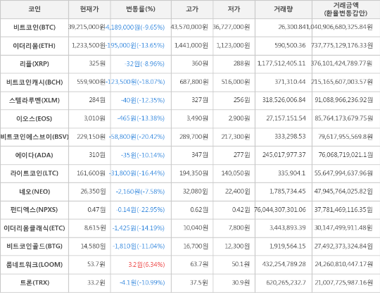 또한, 비트코인에스브이(-20.42%, 229,150원), 비트코인캐시(-18.07%, 559,900원), 라이트코인(-16.44%, 161,600원), 이더리움클래식(-14.19%, 8,615원), 이더리움(-13.65%, 1,233,500원), 이오스(-13.38%, 3,010원), 스텔라루멘(-12.35%, 284원), 비트코인골드(-11.04%, 14,580원), 트론(-10.99%, 33.2원), 에이다(-10.14%, 310원), 리플(-8.96%, 325원), 네오(-7.58%, 26,350원)가 하락세를 나타냈다.