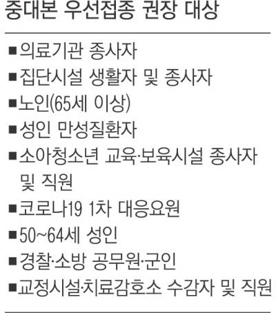 방대본은 이날 ‘우선접종 권장 대상(안)’을 공개했다. 의료기관 종사자, 집단시설 생활자 및 종사자, 성인 만성질환자, 노인(65세 이상), 50∼64세 성인 등이 우선접종 대상이다. 50세 이상 성인과 65세 이상 노인을 구분한 것은 우선접종 순서에 차이를 두겠다는 뜻으로 풀이된다. 방역당국은 우선접종 대상 범위를 확정하기 위해 각 지방자치단체와 관계부처, 관련 협회를 통해 구체적인 규모를 파악 중이다. 우선접종 규모는 3200만~3600만명으로 추정하고 있다.