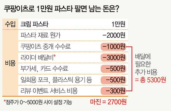 서울 신림동에서 파스타 가게를 운영하는 김지훈 씨(가명) 사례를 살펴보자. 김 씨가 1만원짜리 크림 파스타를 팔았을 때 원가는 2000원, 김 씨가 주로 이용하는 배달 플랫폼 ‘쿠팡이츠’ 이용료는 전체 4500원이다. 라이더 배달비(약 3000원)와 쿠팡이츠 중개 수수료(1000원), 여기에 기타 부가세와 카드 수수료를 포함한 금액이다. 일회용 포크, 냅킨, 비닐, 파스타와 피클을 담는 용기 등 포장에 필요한 비용을 다 더하면 500원 수준. 여기에 리뷰 이벤트로 증정하는 서비스 음료·음식 원가가 평균 300원 정도다. 원가를 제외하고 배달에 추가로 드는 비용만 5300원. 김 씨 수중에 남는 돈은 2700원뿐이다.
