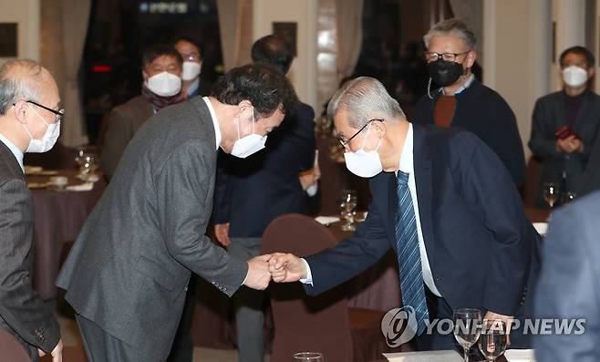 (서울=연합뉴스) 더불어민주당 이낙연 대표와 국민의힘 김종인 비상대책위원장이 11일 서울 중구 프레스센터에서 열린 '관훈클럽 창립 64주년 기념식'에 참석해 인사를 하고 있다. 2021.1.11 [국회사진기자단]