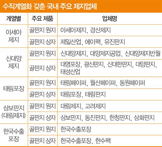 아세아제지는 골판지 원지를 만드는 동시에 종속회사인 유진판지, 제일산업, 에이팩을 통해 골판지와 골판지 상자 제조업도 하고 있다. 특히 표면지용 라이너지에서 40%에 가까운 시장점유율을 차지하고 있는 국내 1위 업체다. 태림포장은 시장점유율 17%의 국내 1위 골판지 상자 제조업체다. 태림페이퍼, 월산페이퍼 등 계열사를 통해 원지도 생산한다. 삼보판지 역시 자회사인 고려제지와 대림제지로부터 총 원재료의 90%에 가까운 원지를 매입하고 있어 원지-원단-골판지 상자로 이어지는 수직계열화를 갖췄다.