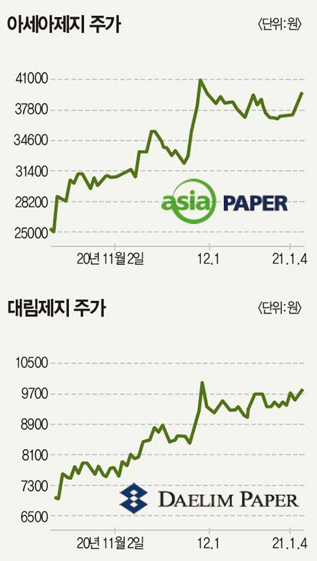 실제로 포장·제지주는 사회적 거리두기 2~2.5단계를 오갔던 지난 9월 이후 큰 폭의 상승세를 보이고 있다. 한국거래소에 따르면 이 기간(2020년 9월 1일~2021년 1월 7일) 아세아제지 주가가 51.4% 오른 것을 비롯해 태림포장 46.8%, 삼보판지 52.3%, 신대양제지 21.6% 등 관련주가 일제히 급등했다.
