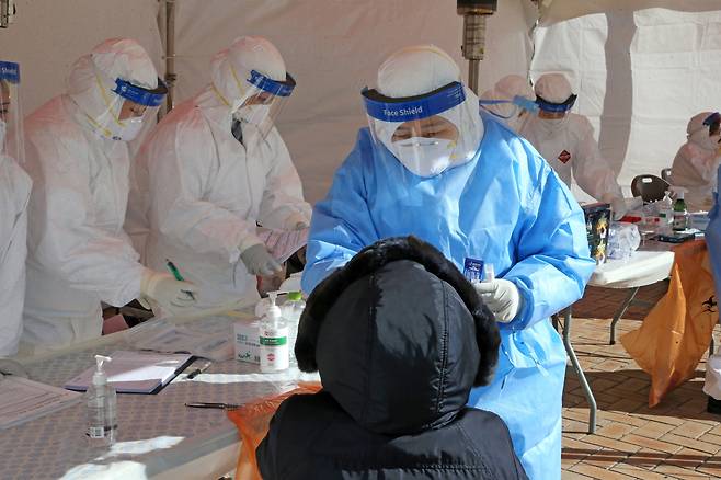 | ▲ 6일 오후 경북 포항시청 앞에 설치된 임시 선별검사소에서 시 공무원 등이 신종 코로나바이러스 감염증(코로나19) 검사를 받고 있다. |