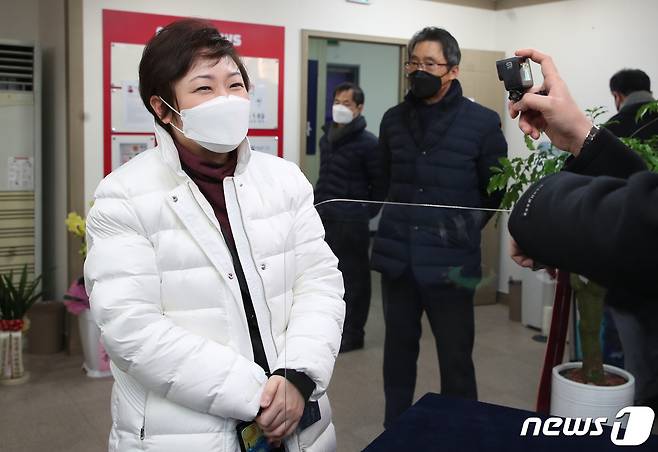 (부산=뉴스1) 여주연 기자 = 이언주 국민의힘 부산시장 예비후보가 11일 오후 부산 부산진구 이언주 선거사무소에서 취재진과 대화를 나누고 있다. 이날 안철수 국민의당 대표가 후보의 선거사무소에 격려차 방문할 예정이었지만 안 대표 측이 방문 취소 의사를 전달해 만남이 무산됐다. 2021.1.11/뉴스1