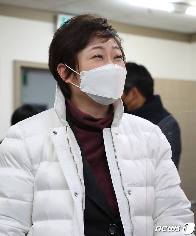(부산=뉴스1) 여주연 기자 = 이언주 국민의힘 부산시장 예비후보가 11일 오후 부산 부산진구 이언주 선거사무소에서 취재진과 대화를 나누고 있다. 이날 안철수 국민의당 대표가 후보의 선거사무소에 격려차 방문할 예정이었지만 안 대표 측이 방문 취소 의사를 전달해 만남이 무산됐다. 2021.1.11/뉴스1