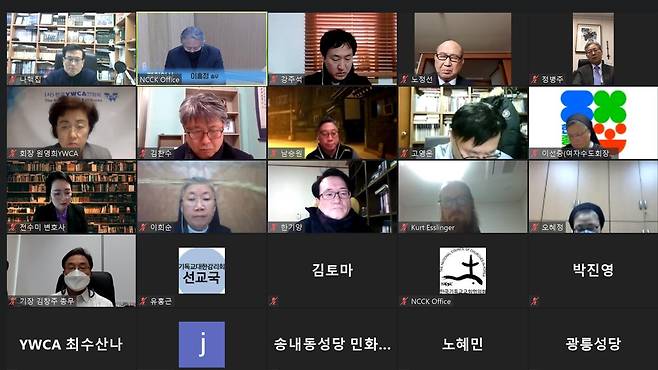 (서울=연합뉴스) 한국기독교교회협의회(NCCK) 화해·통일위원회와 한국천주교주교회의 민족화해위원회 관계자들이 11일 '대북전단 살포금지법 제정과 민족의 화해와 평화'를 주제로 화상회의 플랫폼 줌(Zoom)을 통해 온라인 공청회를 진행하고 있다. 2021.1.11 [NCCK 제공. 재판매 및 DB 금지]