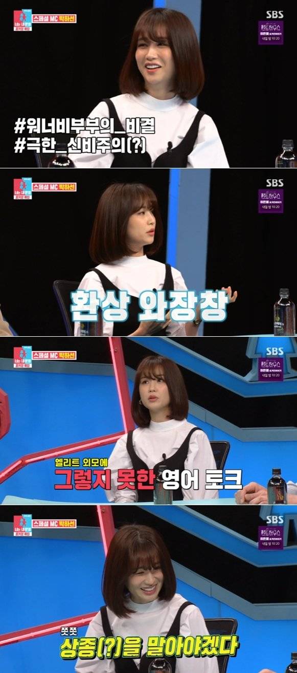 박하선은 류수영이 송창의 못지않은 ‘투머치토커’라고 밝히며 “과묵한 남자를 재미없어서 싫어했는데 지금 이상형은 과묵한 남자”라고 너스레를 떨었다. 그는 류수영과의 첫 만남에 대해 “드라마에서 처음 만났는데 첫 회식 때 굉장히 실망했다”고 운을 띄웠다. 박하선은 “이미지가 굉장히 좋았는데 술을 먹으니 영어로 말을 하더라. 영어를 잘 하는데 평소에는 안 쓴다. 내가 알아듣지도 못하니까 힘들더라. ‘저 분과는 상종하지 말아야겠다’ 싶었다”고 회상했다.