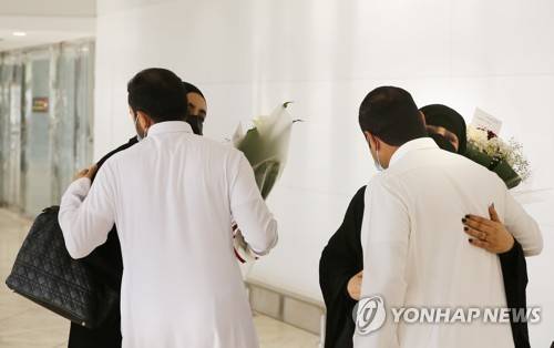 Saudi national Meshaal Al-Anzi right, and his brother hug their Qatari sister Marzoka, right, and her daughter upon their arrival on the first Qatar Airways plane in three years to land at King Khalid Airport in Riyadh, Saudi Arabia, Monday, Jan. 11, 2021. Saudi Arabia, along with the UAE, Bahrain and Egypt, ended a three-year dispute with Qatar following a Gulf Cooperation Council (GCC) summit in AlUla last week. (AP Photo/Amr Nabil)