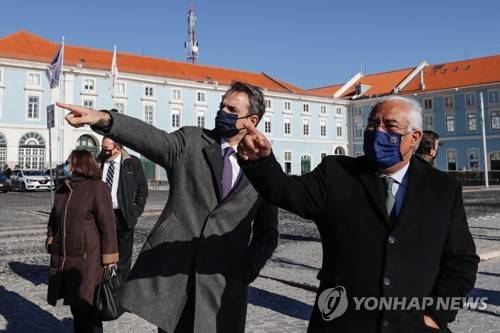 epa08931401 Greek Prime Minister Kyriakos Mitsotakis (L) and his Portuguese counterpart Antonio Costa (R) take a walk after their visit to the Portuguese navy headquarters in Lisbon, 11 January 2021. EPA/TIAGO PETINGA