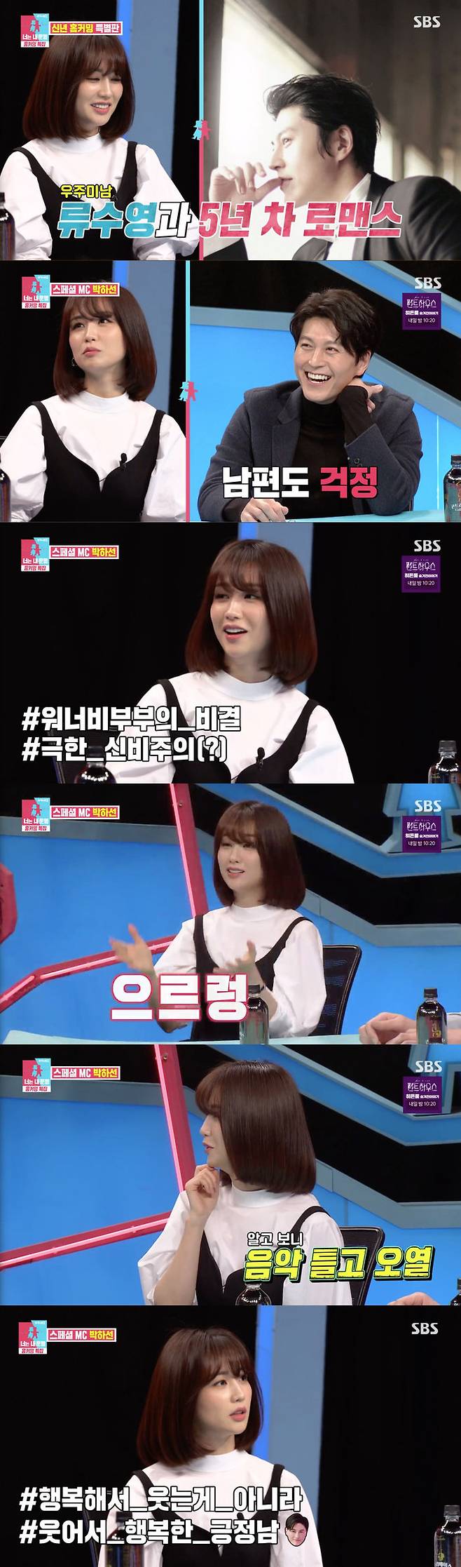 이어 박하선은 "하루는 남편이 너무 늦게 귀가를 해서 화가 폭발했다. 그런데 저쪽에서 음악을 듣고 있더라. 싸웠는데 음악을 듣다니 이게 뭔가 싶어서 더 화가 났다. 그런데 보니까 음악을 크게 틀고 울고 있더라"라고 말해 모두를 놀라게 했다.