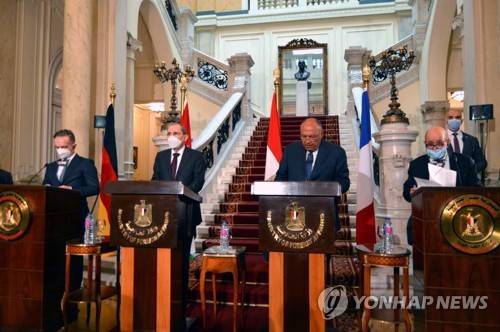 epa08931418 Egyptian Minister of Foreign Affairs Sameh Shoukry (2-R) holds a press conference alongside Jordan's Minister of Foreign Affairs Ayman Safadi (2-L), France's Foreign Affairs Minister Jean-Yves Le Drian (R) and Gernman Minister of Foreign Affairs Heiko Maas (L) at Tahrir palace, in Cairo, Egypt, 11 January 2021. The meeting is aimed at renewing the peace effort at the region, in order to reach a peaceful settlement to the Palestinian-Israeli conflict on the basis of the two-state solution. EPA/STR