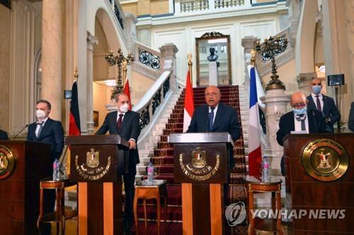 epa08931420 Egyptian Minister of Foreign Affairs Sameh Shoukry (2-R) holds a press conference alongside Jordan's Minister of Foreign Affairs Ayman Safadi (2-L), France's Foreign Affairs Minister Jean-Yves Le Drian (R) and Gernman Minister of Foreign Affairs Heiko Maas (L) at Tahrir palace, in Cairo, Egypt, 11 January 2021. The meeting is aimed at renewing the peace effort at the region, in order to reach a peaceful settlement to the Palestinian-Israeli conflict on the basis of the two-state solution. EPA/STR
