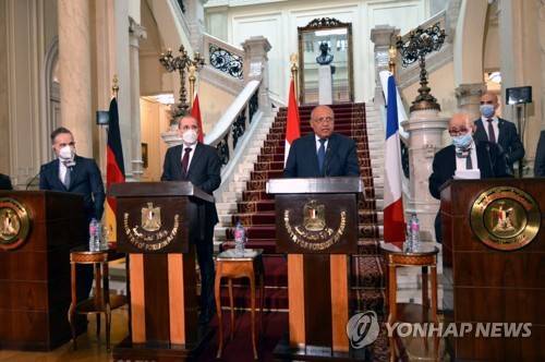 epa08931419 Egyptian Minister of Foreign Affairs Sameh Shoukry (2-R) holds a press conference alongside Jordan's Minister of Foreign Affairs Ayman Safadi (2-L), France's Foreign Affairs Minister Jean-Yves Le Drian (R) and Gernman Minister of Foreign Affairs Heiko Maas (L) at Tahrir palace, in Cairo, Egypt, 11 January 2021. The meeting is aimed at renewing the peace effort at the region, in order to reach a peaceful settlement to the Palestinian-Israeli conflict on the basis of the two-state solution. EPA/STR