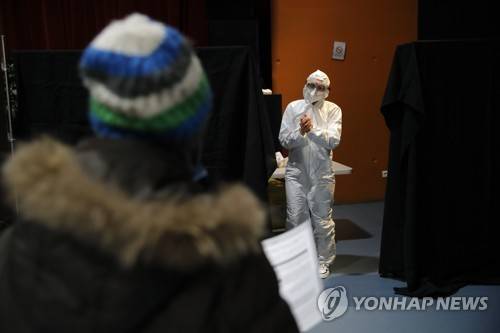 A woman arrives to be tested for Covid-19 at a mass testing center in Bagneux, outside Paris, France, Monday, Jan.11, 2021. Authorities are launching a weeklong mass testing program to assess the rate of Covid-19 infections and assess the spread of the Kent variant, a highly contagious coronavirus strain that first appeared in southern England in November. (AP Photo/Christophe Ena)