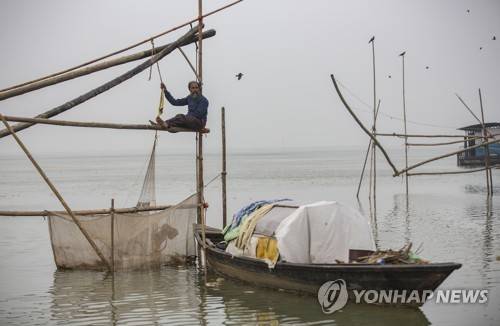 A fisherman catches fish with his fishing net, in the river Brahmaputra in Gauhati, in the northeastern state of Assam, India, Monday, Jan. 11, 2021. Brahmaputra is one of Asia's largest rivers, which passes through China's Tibet region, India and Bangladesh before converging into the Bay of Bengal. (AP Photo/Anupam Nath)