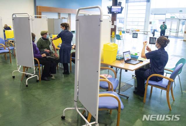 [엡솜=AP/뉴시스] 11일 영국 런던 부근의 경마장에 백신 접종센터가 차려져 국가건강서비스(NHS) 의료진이 코로나 19 백신 주사를 놓고 있다. 확진자가 누계 300만 명을 넘어선 영국은 현재 하루 20만 명에게 백신 주사를 놓고 있다고 맷 행콕 보건장관이 10일 말했다. 2021. 1. 11.