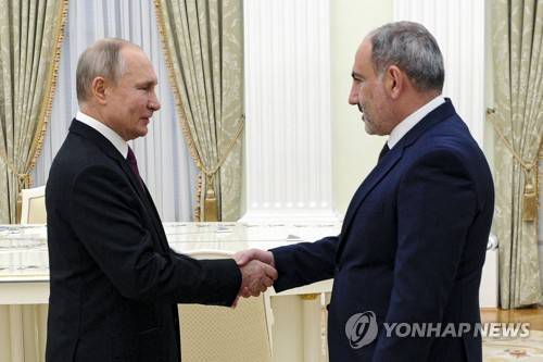 Russian President Vladimir Putin, right, greets Armenian Prime Minister Nikol Pashinyan prior to their talks in the Kremlin in Moscow, Russia, Monday, Jan. 11, 2021. Putin hosted the leaders of Armenia and Azerbaijan for talks after six weeks of fierce fighting over Nagorno-Karabakh that ended with a Russia-brokered peace deal in November. (Mikhail Klimentyev, Sputnik, Kremlin Pool Photo via AP) POOL PHOTO