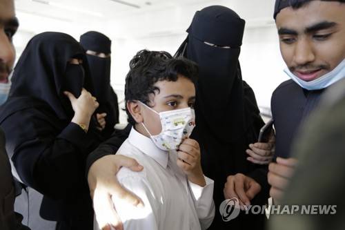 Qatari Khaled, 12, is greeted by his Saudi aunts as he arrives on the first Qatar Airways plane in three years to land at King Khalid Airport in Riyadh, Saudi Arabia, Monday, Jan. 11, 2021. Saudi Arabia, along with the UAE, Bahrain and Egypt, ended a three-year dispute with Qatar following a Gulf Cooperation Council (GCC) summit in AlUla last week. (AP Photo/Amr Nabil)