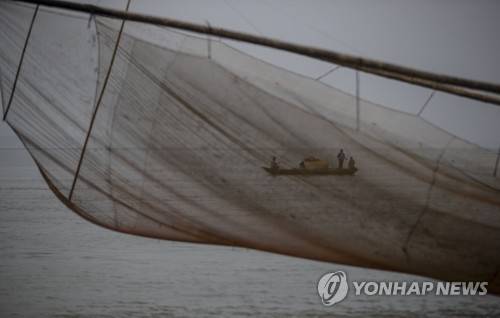 A fisherman catches fish with his fishing net, unseen, as fishermen row a boat in the river Brahmaputra in Gauhati, in the northeastern state of Assam, India, Monday, Jan. 11, 2021. Brahmaputra is one of Asia's largest rivers, which passes through China's Tibet region, India and Bangladesh before converging into the Bay of Bengal. (AP Photo/Anupam Nath)