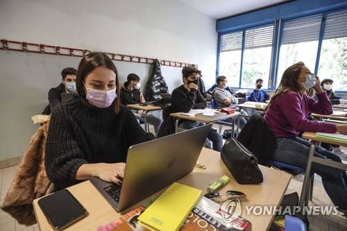 High school students wear face masks to curb the spread of COVID-19 during a lesson as students returned to classrooms after few months of online schooling due to the coronavirus pandemic, in Florence, Italy, Monday, Jan. 11, 2021. Tuscany is one of the first regions in Italy to reopen high schools with half of the students attending in class and the other half by remote. (Pietro Masini/LaPresse via AP) ITALY OUT