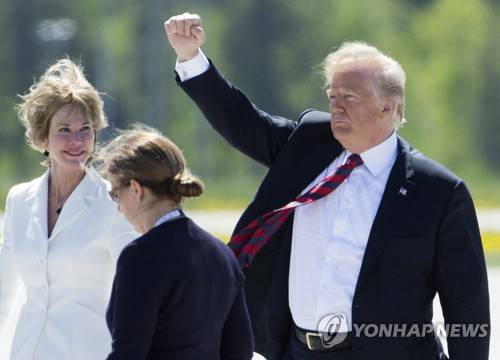 epa08931469 (FILE) - US President Donald J. Trump (R) gestures on the tarmac beside then US Ambassador to Canada Kelly Craft (L) after arriving at Canadian Forces Base Bagotville in La Baie, Quebec, Canada, 08 June 2018 (reissued 11 January 2021). US Secretary of State Mike Pompeo on 08 January 2021 said United States' ambassador to the United Nations, Kelly Craft would visit Taiwan from 13 to 15 January 2021. EPA/MICHAEL REYNOLDS *** Local Caption *** 55005259