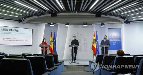 epa08931477 Spanish Home Minister Fernando Grande-Marlaska (C), Transport Minister Jose Luis Abalos (R) and Defence Minister Margarita Robles address a press conference on the situation in Spain due to 'Filomena' snow storm and the subsequent cold wave, in Madrid, central Spain, 11 January 2021. The cold wave is to hit Spain in the following days. EPA/Ballesteros / POOL