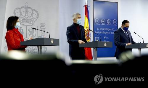 epa08931481 Spanish Home Minister Fernando Grande-Marlaska (C), Transport Minister Jose Luis Abalos (R) and Defence Minister Margarita Robles address a press conference on the situation in Spain due to 'Filomena' snow storm and the subsequent cold wave, in Madrid, central Spain, 11 January 2021. The cold wave is to hit Spain in the following days. EPA/Ballesteros / POOL