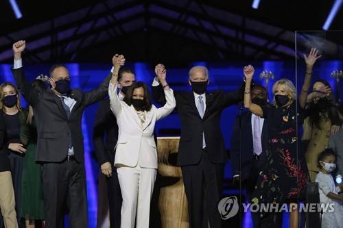FILE - In this Saturday, Nov. 7, 2020, file photo, from left, Doug Emhoff, husband of Vice President-elect Kamala Harris, Harris, President-elect Joe Biden and his wife, Jill Biden, stand on stage together, in Wilmington, Del. The theme for Biden’s inauguration will be “America United." Unity is an issue that’s long been a central focus for Biden but one that’s taken on added weight in the wake of the violence at the U.S. Capitol. (AP Photo/Andrew Harnik, Pool, File) SATURDAY, NOV. 7, 2020, FILE, POOL IMAGE