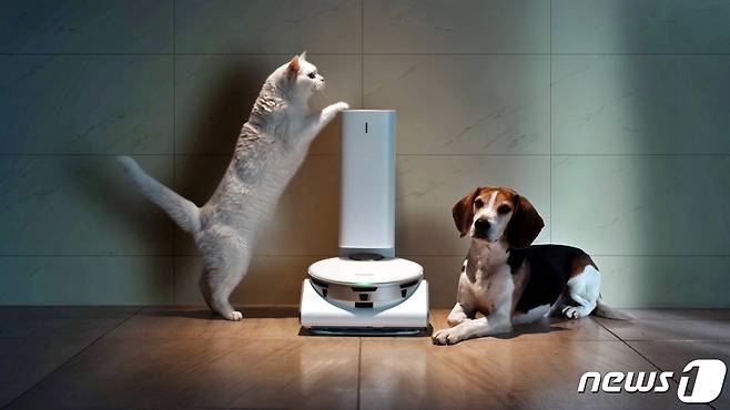 사진은 프레스컨퍼런스에 소개된 '삼성 제트봇 AI' 로봇청소기와 '스마트싱스 펫(SmartThings Pet)' 케어 서비스.