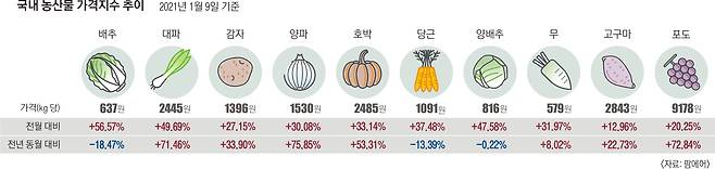 11일 유통업계에 따르면 최근 국내 농축수산물 등 밥상에 오르는 대부분의 식료품 가격이 큰 폭으로 올랐다. 국내 농산물 가격 데이터 전문기업인 팜에어가 주요 농산물 가격 추이를 분석한 결과 배추, 대파, 감자, 양파, 호박, 당근, 양배추, 무, 고구마, 포도 등 농산물 10개 품목의 ㎏당 평균가격이 전월 대비 최대 50% 이상 상승한 것으로 나타났다. 지난해 같은 기간과 비교해도 배추, 당근, 양배추를 제외한 7개 품목의 가격이 최대 70% 올랐다. 닭고기, 오리고기, 계란은 지난해 11월 발생한 조류인플루엔자(AI)가 겹치면서 최근 가격이 더 올라 일부 마트에선 계란 한 판이 7000원대를 돌파했다.