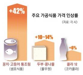 이를 원재료로 한 가공식품들의 가격도 줄줄이 인상되고 있다. 국내 두부 시장 1위 업체 풀무원은 이달 중 두부를 최대 14%, 콩나물은 최대 10% 인상하기로 했다. 현재 4000원대 후반인 풀무원 국산 콩두부(300g) 제품은 5000원을 넘게 된다. 반찬류 통조림 시장 점유율 1위 기업인 샘표도 오는 18일 꽁치와 고등어 등 수산물 통조림 제품의 가격을 42% 인상한다. 샘표는 이미 지난 5일에도 깻잎과 명이나물, 메추리알장조림 등 통조림 제품의 가격을 평균 36% 올렸다. 원재료 가격이 올라 제품 가격이 올랐다는 설명이다.