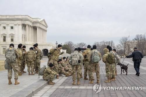 epa08931495 Members of the New York National Guard form up on the East Front of the US Capitol in Washington, DC, USA, 11 January 2021. Speaker of the House Nancy Pelosi has said she will introduce articles of impeachment today against US President Donald J. Trump for incitement of insurrection following the attack on the Capitol last week as lawmakers worked to certify Joe Biden as the next President of the United States. EPA/SHAWN THEW