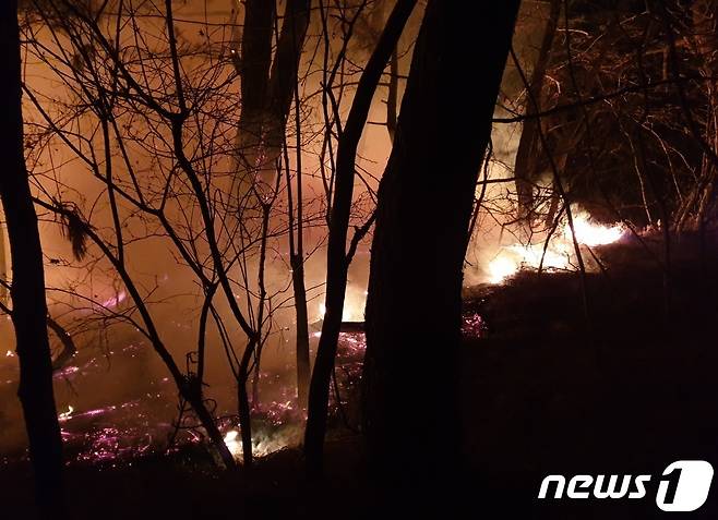 (서울=뉴스1) 이동해 기자 = 11일 경북 영덕군 영덕읍의 한 야산이 화염에 휩싸여 있다.