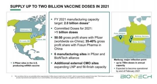 바이오엔테크는 지난해 9월 중순 스위스 기업 노바티스로부터 독일 서부 마부르크에 있는 백신 생산시설을 인수했다. 이 시설에서는 1년에 7억5천만회분 생산이 가능하다.