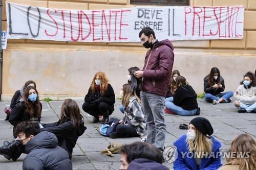 High school students stage a protest against online schooling outside their high school, in Rome, Monday, Jan. 11, 2021. High school students have been having online lessons for months as schools closed due to the coronavirus pandemic. Writing on banner hanging behind reads in Italian "The student has to be the present." (Mauro Scrobogna/LaPresse via AP) ITALY OUT
