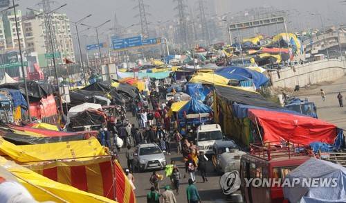 epa08931525 Temporary shelters set up by the farmers on the national highway 24 as farmers take part in ongoing sit-in farmers protest at the New Delhi Uttar Pradesh border, India, 11 January 2021. Thousands of farmers gathered and tried to cross the sealed New Delhi border points, to hold protests against the government's new agricultural laws and to demand for repealing the laws. Farmers have been stopped by the police at the various points outside Delhi border which are connected with neighbouring states of Haryana and Uttar Pradesh. EPA/HARISH TYAGI