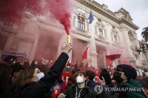 High school students light flares as they gather to protest against online schooling outside the Ministry of Education, in Rome, Monday, Jan. 11, 2021. High school students have been having online lessons for months as schools closed due to the coronavirus pandemic. (Cecilia Fabiano/LaPresse via AP) ITALY OUT