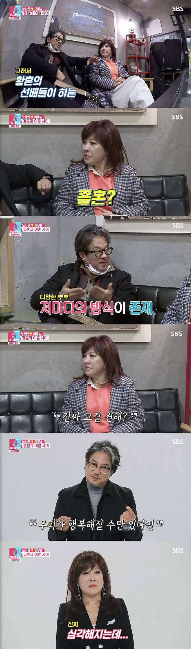 이무송은 "우리가 서로 각자 하고 싶은 걸 하게 시간적인 공간적인 여유를 주자 해서 졸혼을 하는 거 아닌가 싶다"라고 했고, 이에 노사연은 "진짜 그걸 원해?"라고 진지하게 물었다.