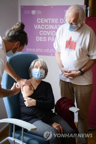 epa08931539 A nurse administers the Pfizer-BioNTech COVID-19 vaccine to Christine Dubochet (C), wife of 2017 Nobel Prize in Chemistry Swiss professor Jacques Dubochet (R), during the vaccinations against the coronavirus disease (COVID-19) on the opening day of the vaccination centers in the canton of Vaud at Ensemble Hospitalier de la Cote, EHC, hospital, in Morges, Switzerland, 11 January 2021. EPA/LAURENT GILLIERON