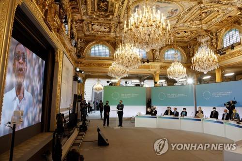 epa08931536 French President Emmanuel Macron (2ndL), flanked by French singer Christophe Mae (L), looks at Senegalese singer Youssou N'Dour speaking on a screen, during the One Planet Summit, part of World Nature Day, at the Reception Room of the Elysee Palace, in Paris, France, 11 January 2021. The One Planet Summit, a largely virtual event hosted by France in partnership with the United Nations and the World Bank, will include French President, German Chancellor and European Union chief. EPA/LUDOVIC MARIN / POOL MAXPPP OUT