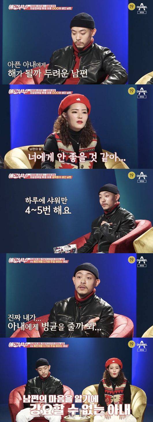 이에 대해 남편은 "결벽증이 심하게 생겼다. 하루에 샤워만 4~5번한다. 그렇지 않으면 침대에 못 들어가겠더라. 화장실에서 안방으로 갈 때 소파에 부딪히면 다시 씻어야 한다. 안방에 가서도 침대 밖을 벗어나면 다시 씻어야 한다. 그래서 밖에서 걸어다닐 때도 손을 잘 못 잡겠는 거다. 진짜 내가 아내에게 병균을 줄까봐. 옆에 있는 건 괜찮고 다른 사람이 아내에게 악수를 청하는 것도 괜찮은데 내 손이 닿으면 안될 것 같다. 너한테 내가 아픔을 주면 어떻게 해 라는 생각이 든다. 병에 걸린 것도 나 때문이지 않을까 라는 생각도 들고. 내 한 순간의 욕정으로 인해 와이프가 또 아프면 어떻게 하지 라는 생각이 드는 것"이라고 말해 안타까움을 더했다.