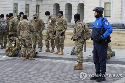 epa08931567 A US Capitol Police officer watches as members of the New York National Guard organize on the East Front of the US Capitol in Washington, DC, USA, 11 January 2021. Speaker of the House Nancy Pelosi has said she will introduce articles of impeachment today against US President Donald J. Trump for incitement of insurrection following the attack on the Capitol last week as lawmakers worked to certify Joe Biden as the next President of the United States. EPA/SHAWN THEW