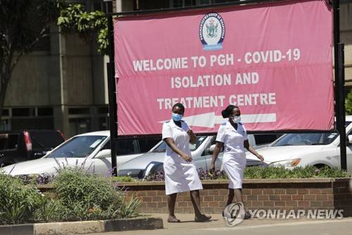 epa08931575 Nurses walk past a banner at the COVID-19 red zone at Parirenyatwa Hospital in Harare, Zimbabwe, 11 January 2021. Zimbabwe could receive its first batch of the COVID-19 vaccine in February 2021, through an initiative led by the World Health Organisation (WHO) known as Covax. EPA/AARON UFUMELI