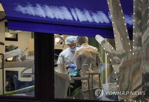 epa08931581 Dentists work in their office in center of Moscow, Russia, 11 January 2021 during the pandemic of SARS-CoV-2 coronavirus. EPA/YURI KOCHETKOV